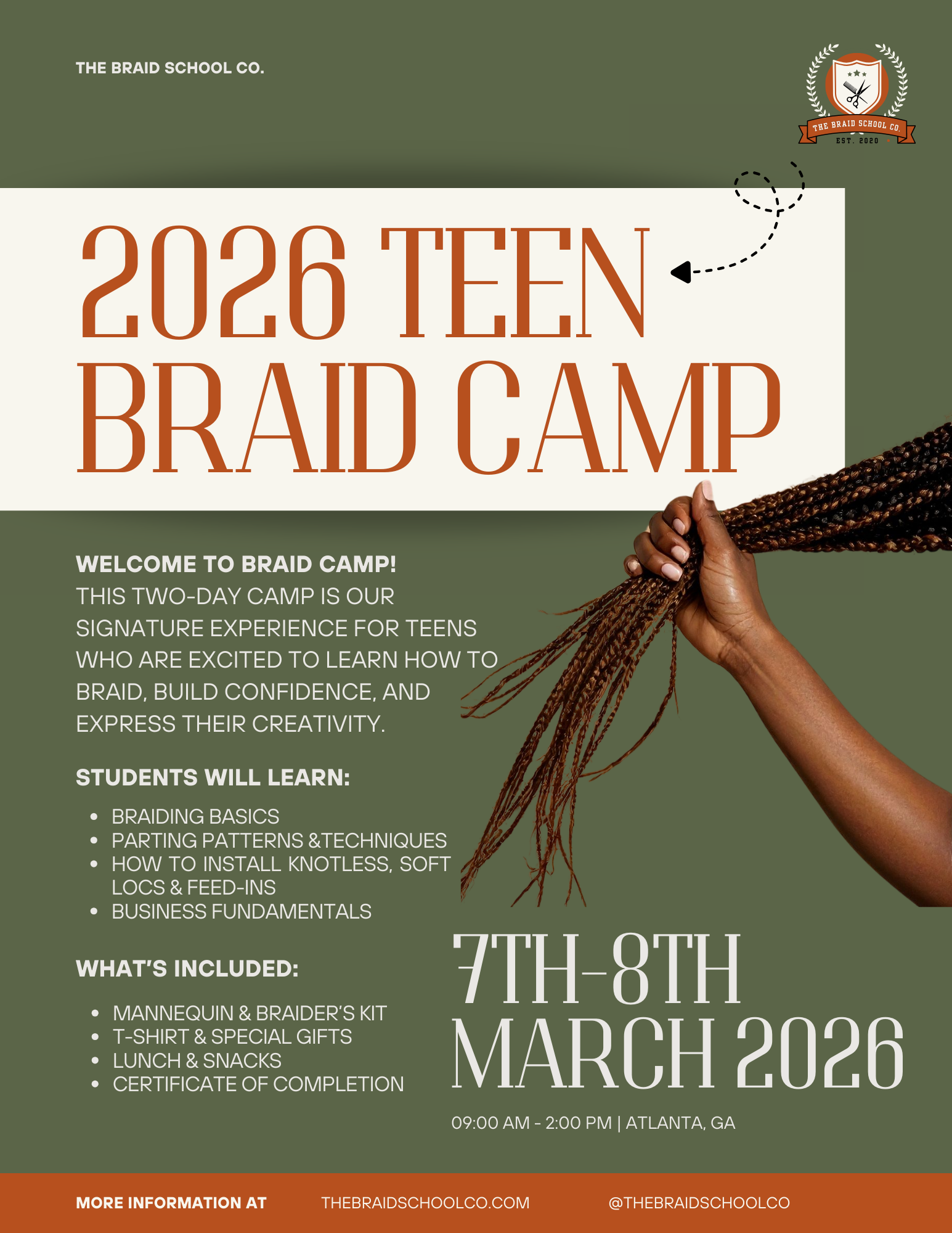 The Braid School Co. is a hands-on braiding education company offering classes, camps, and workshops designed to teach technique, build confidence, and create community through hair.